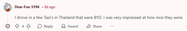 “我在泰国坐过几辆比亚迪出租车,它们给我留下了非常深刻的印象,感觉非常好。”
