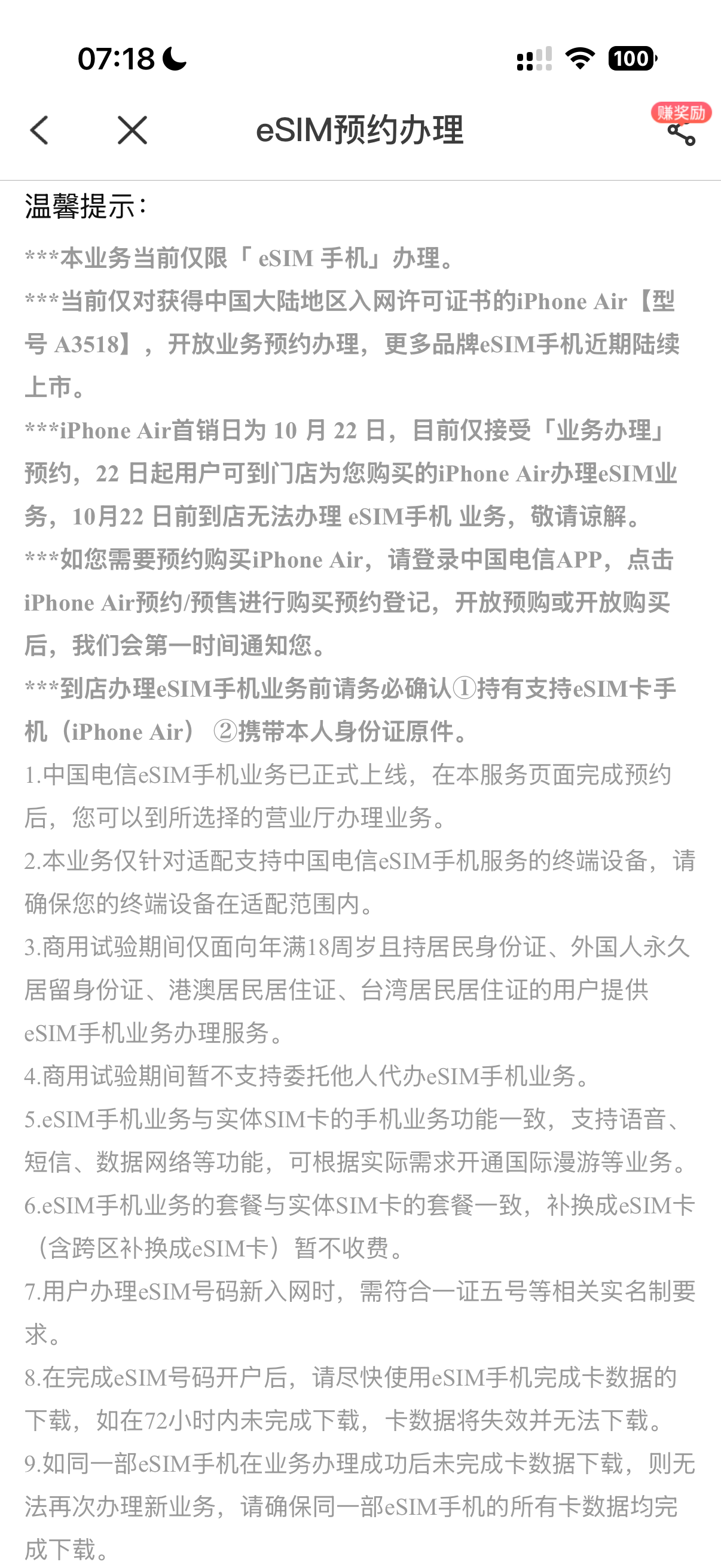 中国电信eSIM预约办理页面显示,商用试验期间仅面向年满18周岁且持居民身份证、外国人永久居留身份证、港澳居民居住证、台湾居民居住证的用户提供eSIM手机业务办理服务。