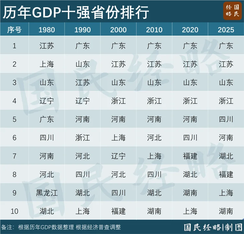 2025年,中国GDP十强省分别为:广东、江苏、山东、浙江、四川、河南、湖北、福建、上海、湖南。