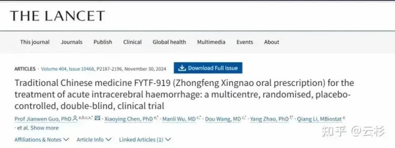 2024年11月,国际医学顶刊《柳叶刀》发布了一篇研究,对1648例中度至重度的急性脑出血患者作为实验对象,依据病情、性别、年龄等,将患者随机分为两组。一组接受中风醒脑液作为药物的治疗,另一组给的是安慰剂。