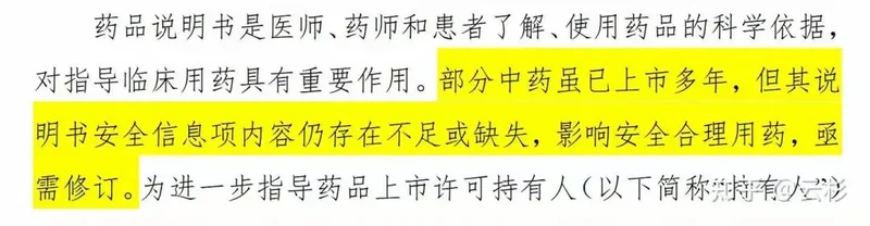 于是到了2022年,国家药监局发布《已上市中药说明书安全信息项内容修订技术指导原则(试行)》,如是强调: “部分中药虽已上市多年,但其说明书安全信息项内容仍存在不足或缺失,影响安全合理用药,亟需修订”。