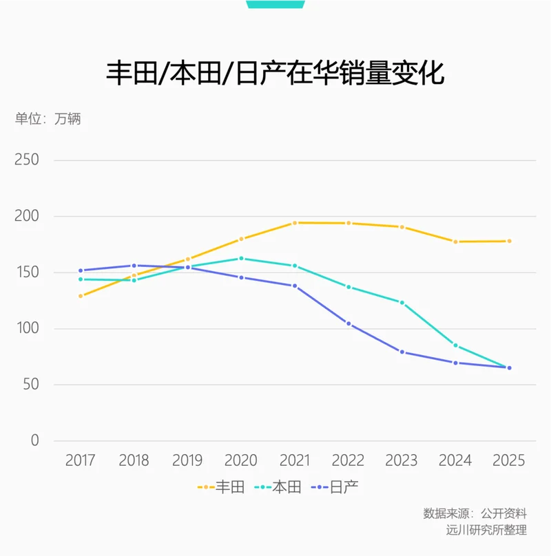 2025年,丰田中国销量微增0.23%,达到178万辆。看似增长微乎其微,实则一扫过去三年下滑趋势,成为日系三强里唯一的幸存者。丰田坚挺的同时,本田和日产这对难兄难弟还在延续下滑趋势,销量已从最高点腰斩。