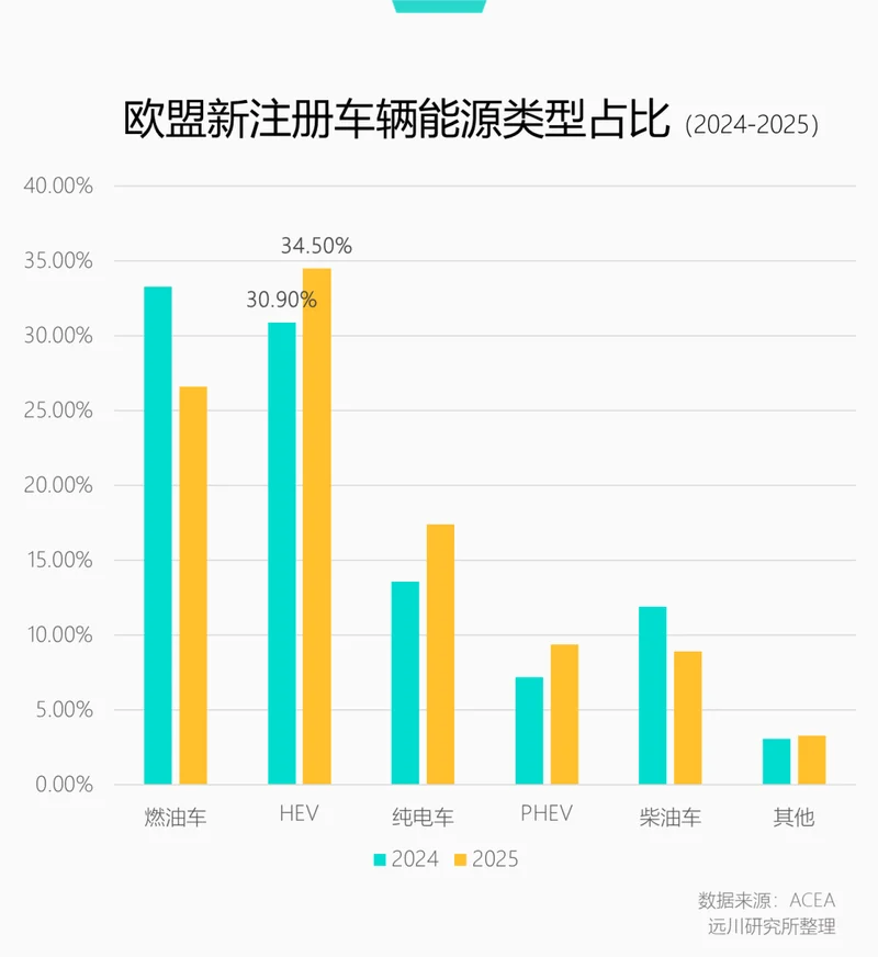 按照欧洲汽车制造商协会(ACEA)的口径[6],2025年欧盟(不含英国)新注册车辆中,HEV占比首次超过燃油车,达到34.5%,纯电和插混车(PHEV)加起来只有26.8%。