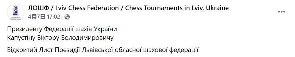 乌克兰当地时间7日,利沃夫国际象棋协会向乌克兰国际象棋协会(FSU)致公开信,要求后者立刻向世界国际象棋协会(FIDE)申请,将俄罗斯、白俄罗斯国际象棋协会“彻底除名”。