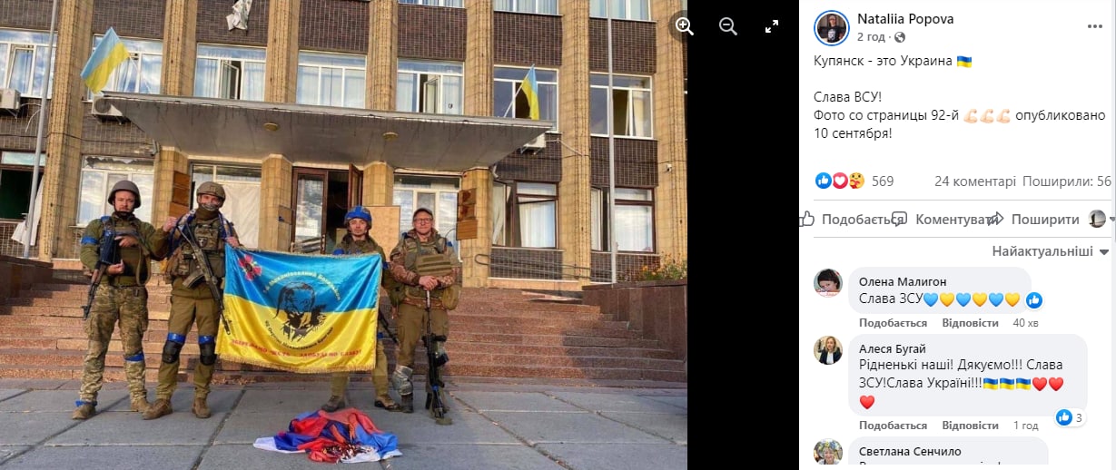 次日,哈尔科夫地区委员会主席顾问娜塔莉亚·波波娃(Natalia Popova)在脸书上发布的照片显示,乌克兰武装部队在库皮扬斯克市政大楼前手举乌克兰国旗。