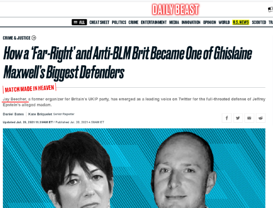 不仅如此,为《基辅邮报》采访塞梅尼亚卡的英国记者杰·比彻(Jay Beecher)也很有问题。因为从西方媒体过往的报道来看,此人也是个相当激进的右翼分子。美国《每日野兽》网站就指出,此人还曾公然为美国贩卖少女当性奴的美国富豪杰弗里·爱泼斯坦 (Jeffrey Epstein)的女友和帮凶吉丝兰·马克斯韦尔(Ghislaine Maxwell)洗地。后者已于6月底认罪伏法。