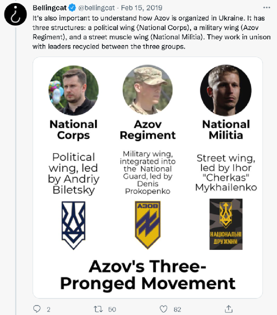 另外,尽管在俄乌冲突开始后,一些西方主流媒体出于反俄的政治宣传需要,开始为亚速营这个几年前还曾被他们批判为新纳粹势力的团体进行辩解,称亚速营有问题的只是其搞政治的那个分支,与如今已经隶属于乌克兰国民警卫队的军事分支关系不大,但Bellingcat在2019年的报道还清楚地指出,这些分支的领导层都是互通的,他们的行动也是一致的。
