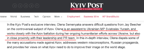 《基辅邮报》还在这篇题为“亚速营:传言背后的那些人”的文章中将塞梅尼亚卡称作是乌克兰一名议员的助手、与亚速营合作紧密的“人道主义”者,以及与亚速营的“领导层和公关团队”关系紧密的知情人士,并称她接受采访是为了“澄清”关于西方那些对亚速营的“误解”以及俄罗斯对亚速营的“政治宣传栽赃”。