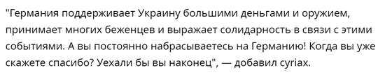 “德国用大量资金和武器支持乌克兰,接收许多难民,并就这些事件表示支持。而您总是攻击德国!您什么时候会说谢谢?您最好还是离开(德国)吧!”