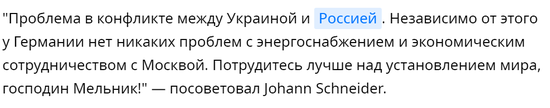 “问题在于乌克兰和俄罗斯之间的冲突。无论如何,德国在能源供应和与莫斯科的经济合作方面不存在任何问题。梅利尼克先生,最好还是费点儿心思实现和平吧!”