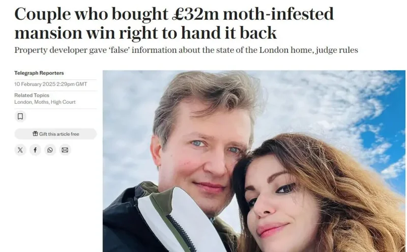 这场噩梦最终诉诸法庭。法官裁定,卖家在交易前给出了关于房屋状况的“虚假”答案,未能“如实披露”严重的虫害问题。因此判决交易撤销,卖家必须退还全部购房款(仅扣除约600万英镑作为买家居住期间的使用费),并另行支付高达400万英镑的损害赔偿金。