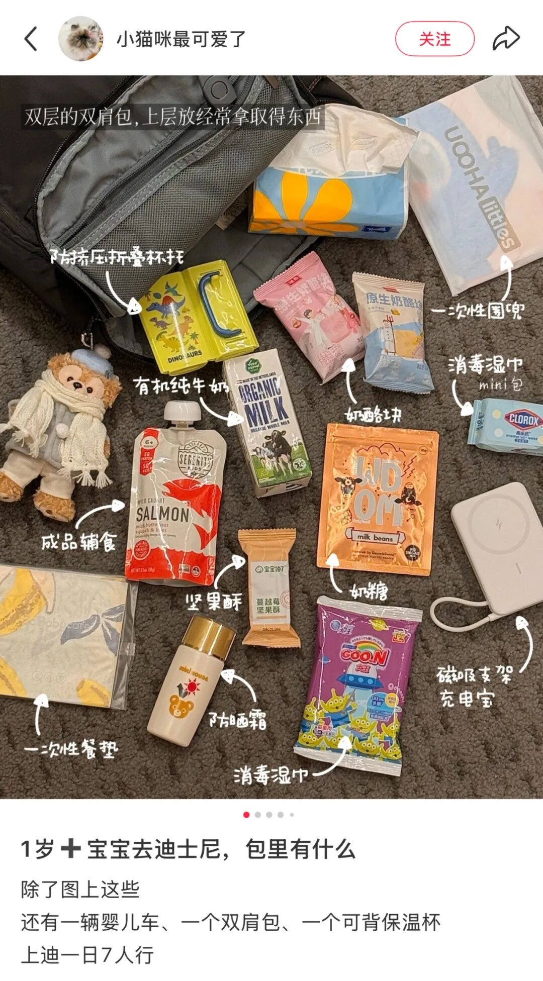 如果你没带推车一时半会又租不到合适的,那太好了,接下来你就可以一直抱着二三十斤的娃了!还有带着不到一岁的娃勇闯迪士尼的新手父母,除了最基本的零食水杯,你还需要准备包括但不限于尿布、湿巾、备用衣服、奶粉、哺乳巾、辅食等一系列必需品[29]。