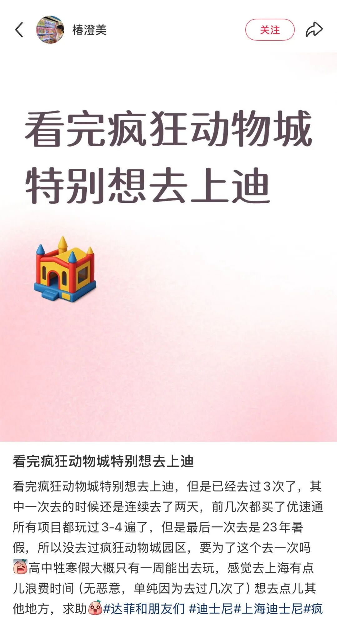 随着《疯狂动物城2》热映,前往迪士尼乐园的计划被许多人提上日程 / 图源小红书博主@椿澄美(已获得授权)