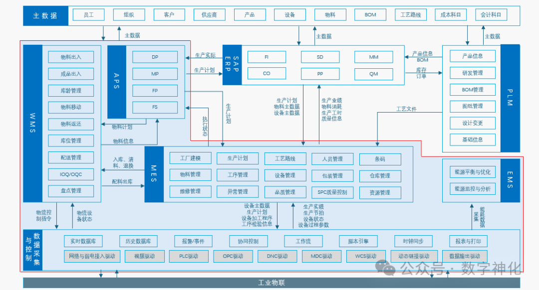 在制造业,从业务流程角度来看,制造企业中ERP(企业资源计划)、PLM(产品生命周期管理)、MES(制造执行系统)、APS(高级计划与排程)、WMS(仓库管理系统)、ESB(企业服务总线)、MDM(主数据管理)等系统之间的结构关系如下: