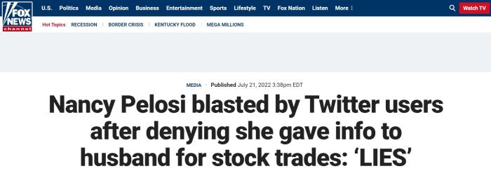 佩洛西否认对丈夫透露股票交易内幕后,网友指责其撒谎。图片来源:美国福克斯新闻网报道截图