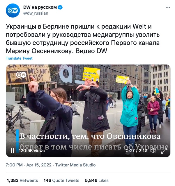 据“德国之声”俄语版4月15日报道,14日,众多乌克兰人在柏林的《世界报》编辑部外聚集,手举抗议牌要求该媒体解雇奥夫扬尼科娃,并齐声高喊“停止宣传!开除奥夫扬尼科娃!”(Stop propaganda! Fire Ovsyannikova!)
