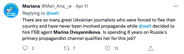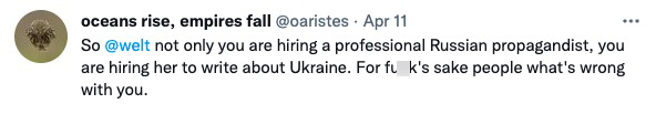 还有人直斥德国《世界报》不仅雇佣了一个“专业的俄罗斯宣传员”,还雇她来报道乌克兰,“到底脑子在想啥?”