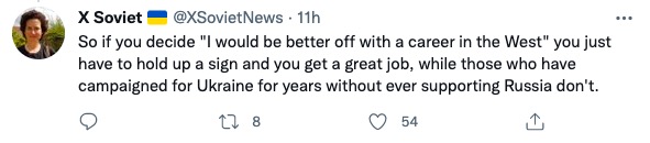 有乌克兰网民在推特发文称:“所以如果你想的是‘我去西方社会后职业发展会更好’,你只需要举起一个牌子,就能得到一份很不错的工作,而那些多年来一直为乌克兰奔走、从未支持过俄罗斯的人却没有这个待遇。”