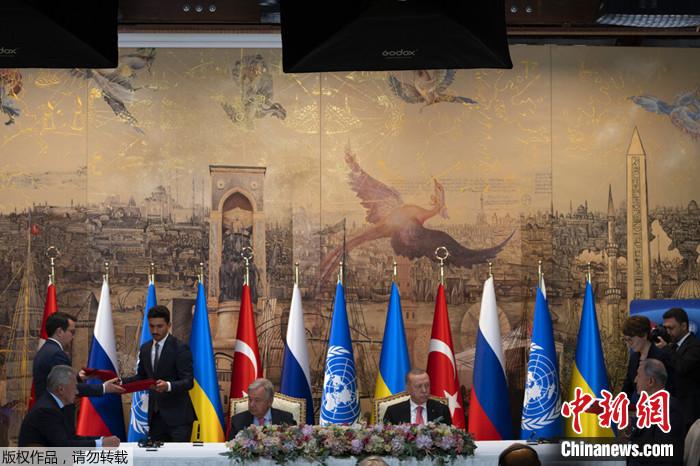 2022年7月22日,土耳其总统埃尔多安和联合国秘书长古特雷斯在伊斯坦布尔主持签署仪式。