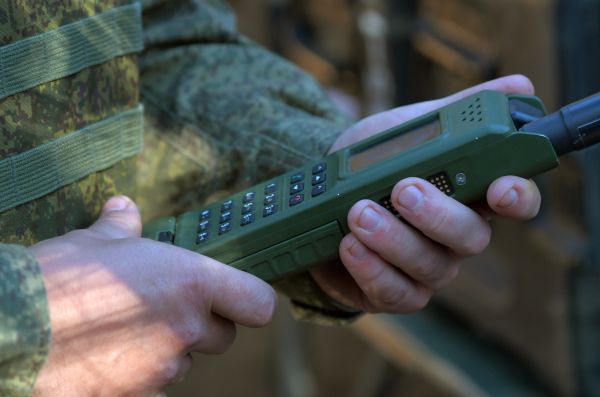 俄罗斯士兵手拿一个“阿扎特”电台(俄罗斯卫星社)