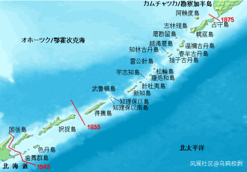在堪察加半岛和北海道岛之间,有一长串的岛屿,共计56个,长达1300公里,被形象地称为“千岛群岛”。而在这一串群岛的最南部,择捉、国后、齿舞、色丹四岛,俄方认为它们是千岛群岛的最南组成部分,即“南千岛群岛”;而日方多称之为“北方四岛”。