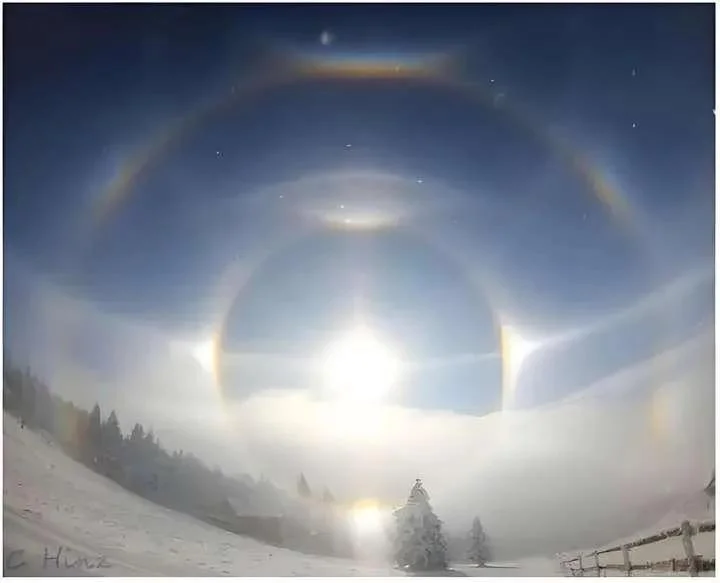 要弄清这场争议,首先得明确“真幻月”该是什么样。从科学定义来看,幻月是标准的大气光学现象,原理和大家更熟悉的“幻日”如出一辙:当月光(本质是月球反射的太阳光)穿过高空零下20℃以下的卷云或卷层云时,会遇到大量六角形扁平冰晶。这些冰晶像整齐排列的“天然棱镜”,能让光线发生反射和折射,最终在真月亮周围形成明亮光点,通常出现在月亮的左右两侧,偶尔会伴随淡淡的光弧。下面是实际拍摄的幻日的图片,幻月与之基本一样。