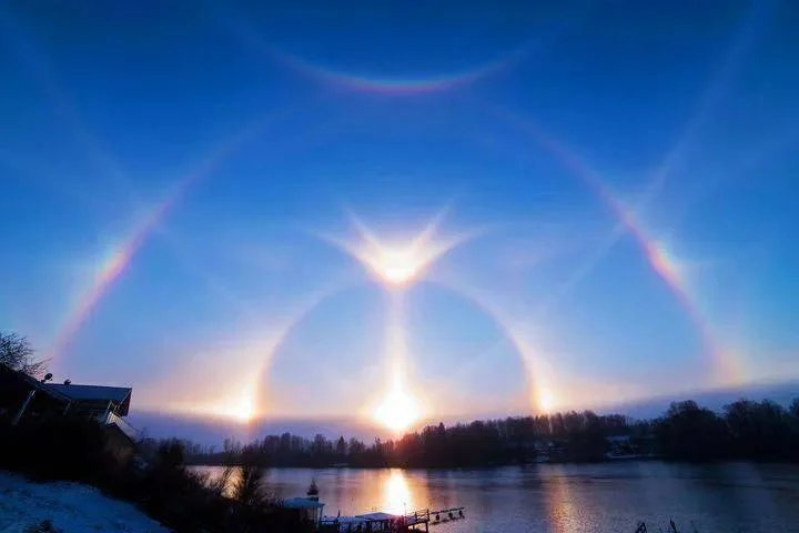 我国曾多次出现过类似的“虚假幻日/幻月”。2023年的2月28日,山西运城的一位网友拍到天空中出现4个太阳,灰色的天空中4个太阳排成一排,拍摄者称从来没见过,但其实他清楚是怎么回事的。