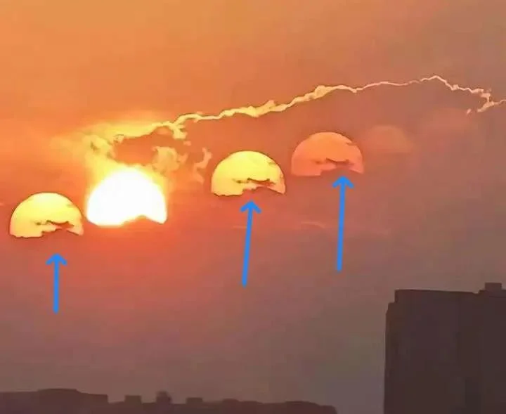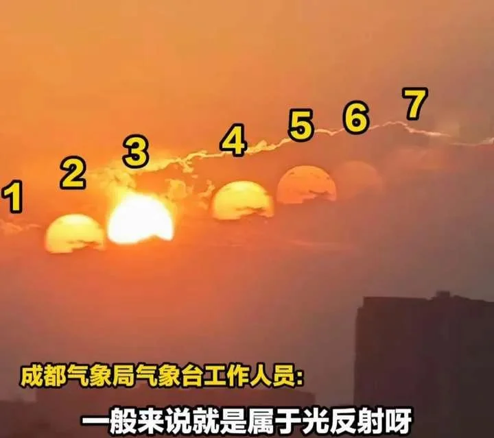 2024年,四川成都市有人在8月18日拍到了7个太阳,一排太阳整齐排列十分壮观,但拍摄者是在一家医院的11楼窗户前拍摄的,很显然也是玻璃的反射和折射现象造成的。