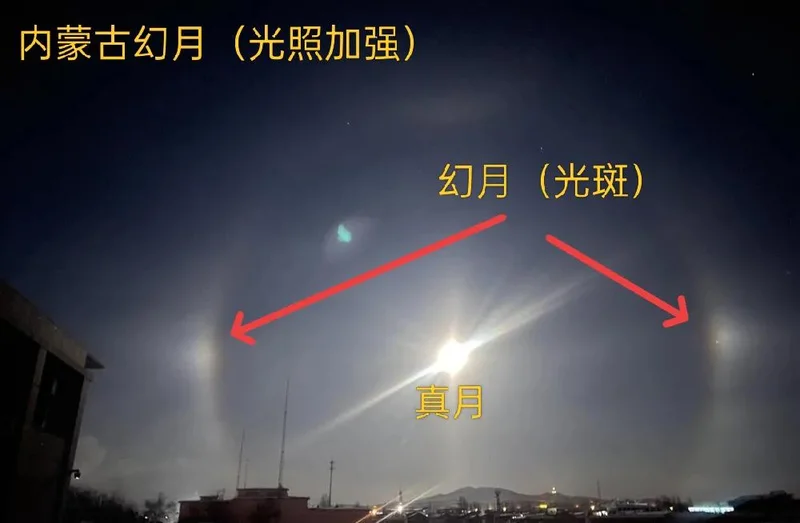 就像2020年我国内蒙古出现的幻月,就是在真月左右各有一个暗弱光斑,符合典型特征。