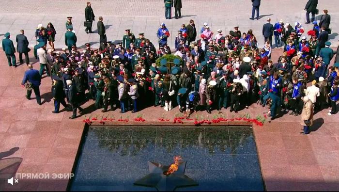 普京最后向无名烈士墓献花,并向代表每个城市的石头献花。无名烈士墓前的铭文写道:“你的名字无人知晓,你的功绩永世长存。”