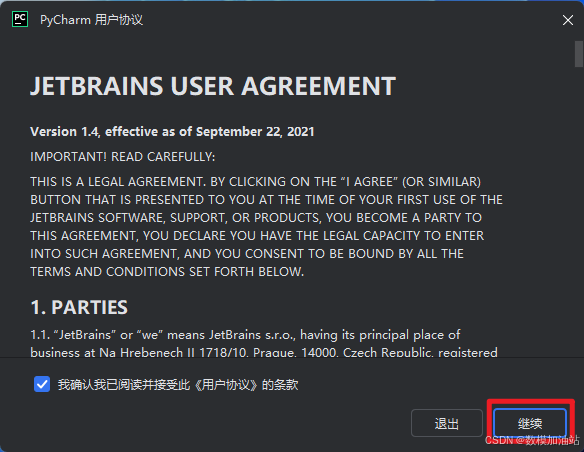 17.接着我们继续打开pycharm,点击【继续】,此时就显示只能适用三十天