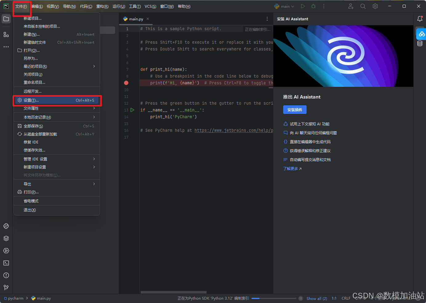 27.重启软件之后,我们需要配置Anaconda环境。点击【文件】下的【设置】