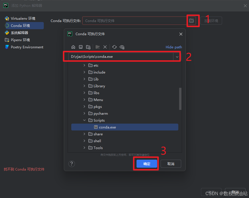 32.选择文件,找到之前安装Anaconda的安装位置,选择文件【Scripts】下的【conda.exe】