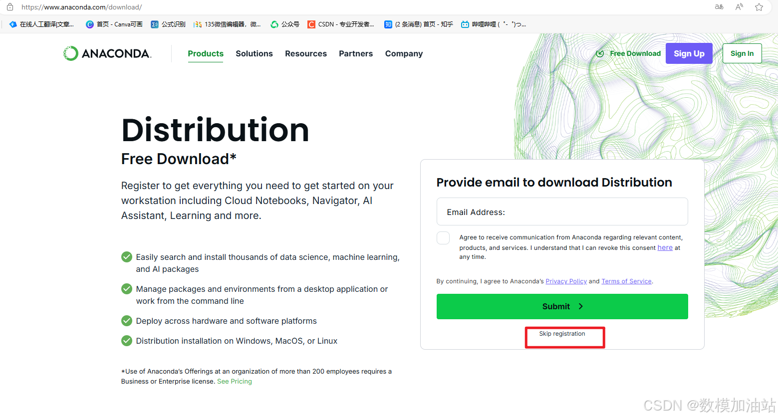 1.首先从官网下载Anaconda,进入官网,点击【skip registration】