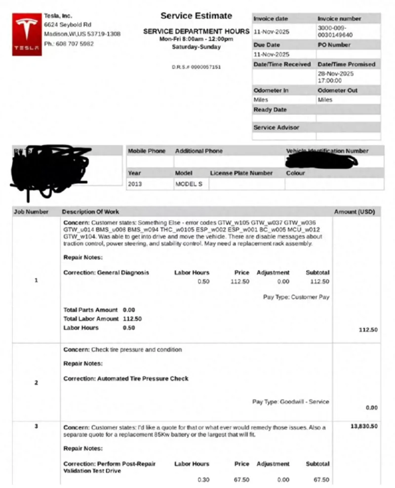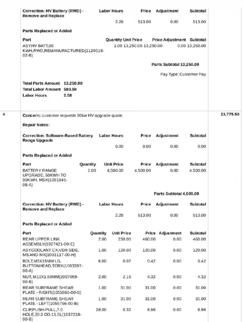 特斯拉提供了更换同款60kWh电池包,或升级为90kWh电池包两种方案。但更换60kWh电池包总价为13830美元(约合人民币96302元),人工费580.5美元,电池本体费用13250美元。若是升级至90kWh电池包,费用则高达23262美元(约合人民币161980元),电池本体售价18000美元。