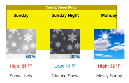 预计在周日,麻州部分地区将受此次降雪叠加大风、沿海洪水风险的影响。