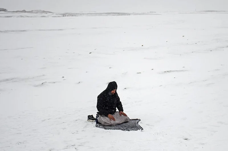 当地时间2026年1月22日,阿富汗马扎里沙里夫郊区,一名阿富汗男子在雪地里祈祷。