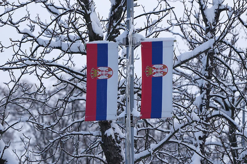 当地时间2026年1月8日,塞尔维亚贝尔格莱德,街头的塞尔维亚国旗被白雪覆盖。