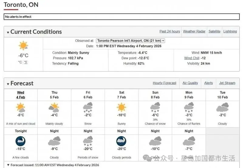 加拿大环境部预测,周四最高气温为零下4度,但清晨在风寒效应下体感温度接近零下16度。周五最高气温料回升至零下2度,将是本周最暖的一天。