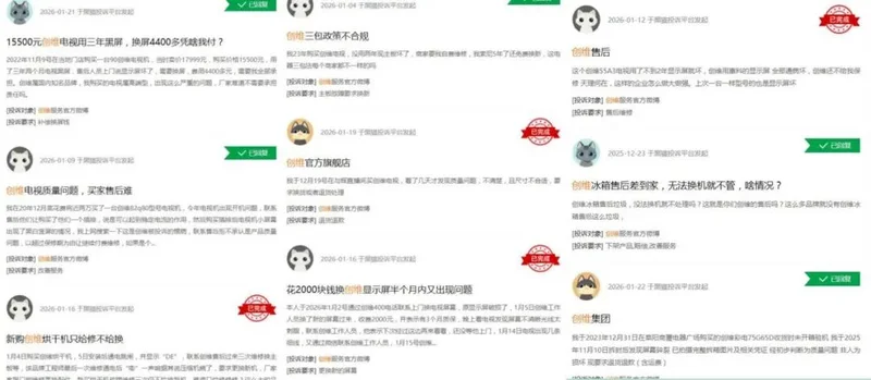 值得一的是,创维被曝出“先涨价后降价”的营销争议外,消费者对创维电视的投诉也不在少数,仅在黑猫平台,2025年12月23日~2026年1月21日,就已经有多条针对创维的投诉,包括但不限于,黑屏、电视质量问题、售后难等等。