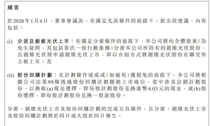 根据创维集团披露的私有化退市及分拆光伏业务上市的核心方案,原有的创维集团将通过股份回购撤销上市地位,其中涉及注销计划股份。分派光伏股份、光伏业务上市及股份回购三项动作互为实施条件,将在同一时间节点完成。