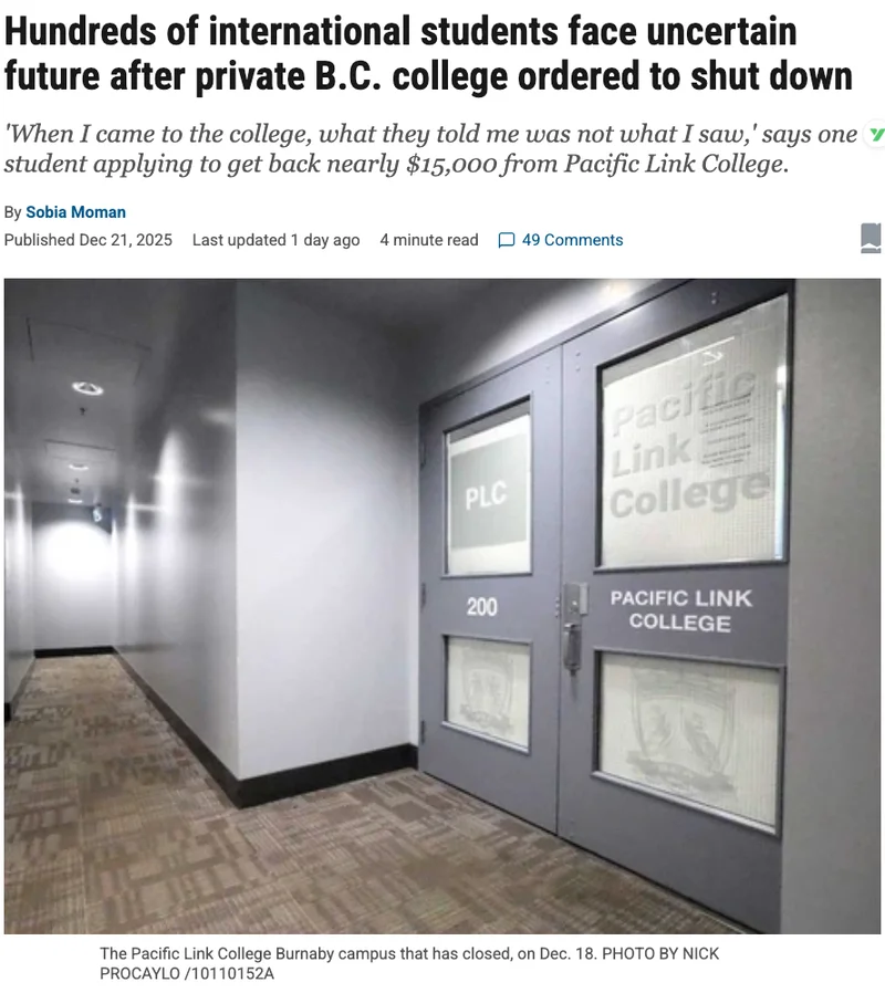 这所被勒令关门的学校名叫Pacific Link College,位于温哥华印度人聚居的素里市,数百名留学生受到影响。