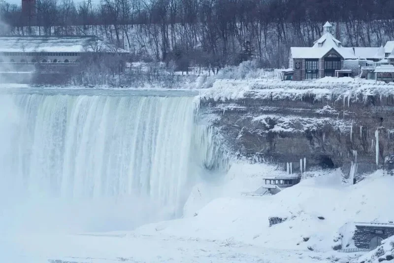 “在经历长时间极寒和降雪后,尼亚加拉瀑布出现局部冰封,冰雾与壮观的冰层结构吸引了来自世界各地的游客和摄影师。”