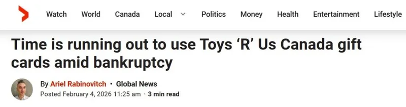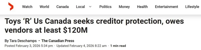 2026年2月2日,Toys ‘R’ Us Canada Ltd. 正式向安大略省法院提交了债权人保护(creditor protection) 申请。