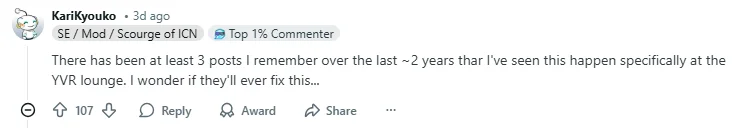 “我记得过去两年左右的时间里,至少有三篇帖子提到过在温哥华机场休息室发生过类似的事情。不知道他们什么时候才能解决这个问题……”