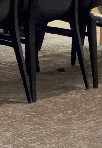 另一个画面显示,一只小老鼠在椅子下面蹦蹦跳跳,心情似乎相当愉快。通过画面难以分辨,它俩是不是同一只小老鼠。