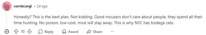 甚至有网友觉得“养猫”是个好主意:“说真的?这是最棒的办法,绝不是开玩笑。好的捕鼠猫根本不在意人,它们所有时间都在抓老鼠。不用毒药、成本低、老鼠远离。这就是为什么纽约有便利店猫(bodega cats)的原因。”
