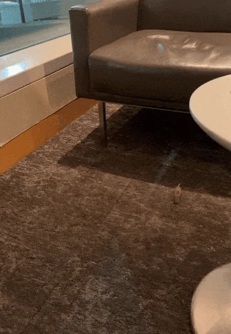 画面显示,一只小老鼠在休息室的地毯上“闲逛”,似乎一点都不害怕人类。