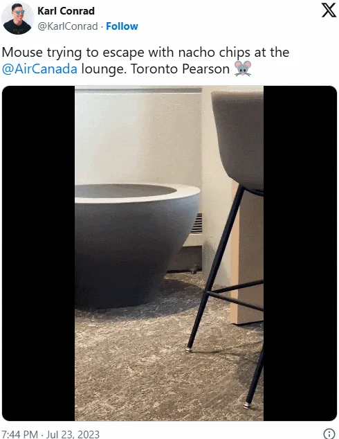 其实不仅仅是温哥华国际机场,多伦多皮尔逊机场也曾曝过“鼠患”。早在2023年,就有多伦多网友分享过一段视频:在加航的休息室,有一只老鼠抱着一个玉米片,正在寻找回家的洞口...