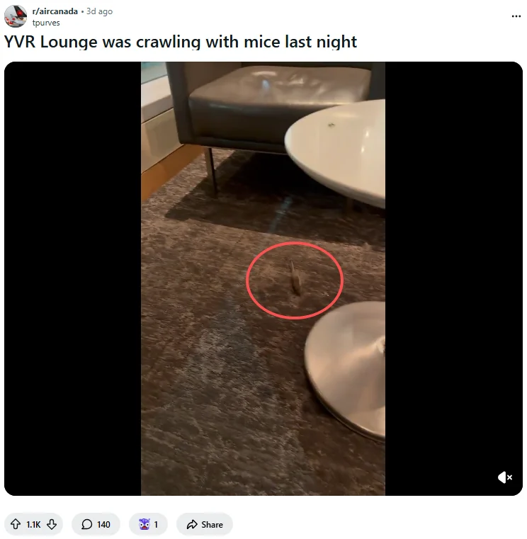 近日,一位网友在Reddit论坛的“加航(Air Canada)”话题下,发布了一段视频:温哥华国际机场(YVR)的休息室(Lounge),到处都是老鼠!